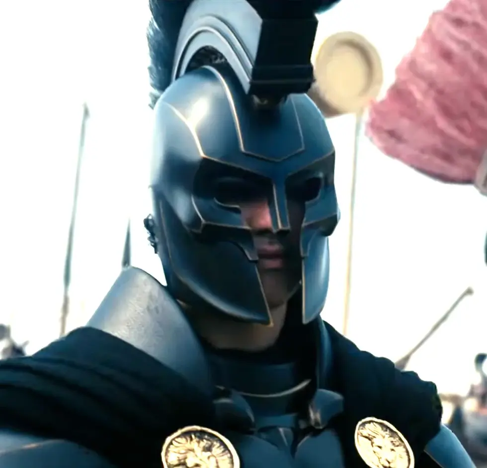 The Trojan war occurred during the bronze age, with soldiers of that time (and as described in The Iliad and The Odyssey) wearing helmets adorned with boar tusks - in Nolan's adaptation, Damon is sporting a helmet and armour of a later Greek era, with the signature red-plume of Roman Centurians.